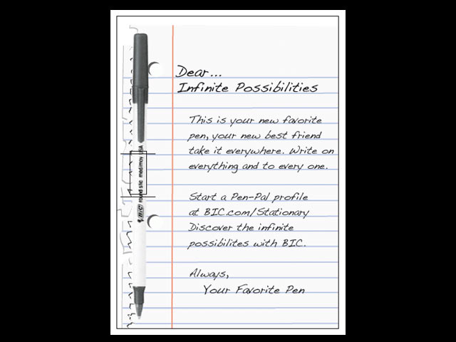 For the new BIC will be targeted towards working mothers, from 25-40, married and hard working. They love to read and write, and spend free time with friends. The strategy was to create a website, print, mailer and logo design for brand extension. We will be using the tagline: 'Your New Favorite Pen.' The media used for this project is a logo design for this brand extension, a direct mailer, magazine print and interactive website.