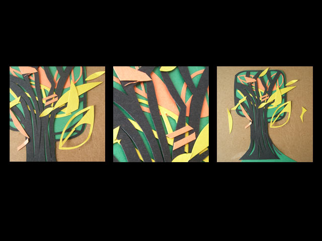 The paper triptych was created with cut construction paper and then photographed with the intention to show the texture and layering effect of the individual pieces.